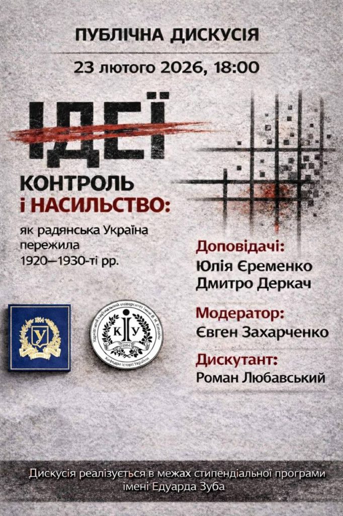 Актуальні події Гостьова лекція М. Пархоменко (Friedrich-Alexander-Universität Erlangen-Nürnberg, Німеччина) Участь викладачів кафедри у workshop «Розуміти модерність…» Магістерський науковий колоквіум до Дня спротиву окупації Автономної Республіки Крим та міста Севастополя Доцента кафедри історії України Дениса Журавльова нагороджено «Подякою Міністерства освіти і науки України» Публічна дискусія «Ідеї, контроль і насильство: як радянська Україна пережила 1920–1930-ті рр.» Професорку кафедри історії України Людмилу Посохову було нагороджено «Подякою» Харківського міського голови Доцент кафедри історії України Григорій Рій презентував свою науково-популярну книгу «Таємні місії ОУН. Міжнародна діяльність в часи Холодної війни» Аспірантка кафедри історії України Юлія Єременко взяла участь в Міжнародному симпозіумі аспірантів з українознавства Аспірантка Юлія Єременко отримала Стипендію імені Едуарда Зуба Гостьова лекція докторки Ірини Скубій (Університет Мельбурна, Австралія) з історії Голодомору 1932-1933 рр. Гостьова лекція професорки Ольги Ковалевської (Інститут історії України НАН України) Студентки кафедри взяли участь у німецько-франко-українському міжнародному обміні Професорка Людмила Посохова взяла участь в Міжнародній конференції з нагоди 410-ї річниці відкриття Києво-Могилянської Академії Аспірантка Влада Сабадаш взяла участь у міжнародному науковому семінарі в Канаді Презентація міжнародного наукового проєкту Приєднання України до міжнародної науково-дослідницької мережі Ювілей Михайла Захаровича Бердути Доцентка Анастасія Ховтура взяла участь у роботі круглого столу в Швеції Доцент Роман Любавський отримав стипендію Меморіального музею Голокосту США Доцент Євген Захарченко взяв участь у літній програмі в Румунії Нерезидентська стипендія аспіранта Сергія Луніна в Університеті Регенсбурга Аспірантка Влада Сабадаш взяла участь у конференції в Фінляндії Дослідницька резиденція доцента Євгена Захарченка у Варшавському університеті Аспірантка Влада Сабадаш взяла участь у роботі журі Всеукраїнського етапу конкурсу МАН Гостьова лекція проф. В.Моравського (Варшавська школа економіки) Доцент Євген Захарченко взяв участь у конференції в Польщі Відійшов у засвіти професор С. О. Наумов Зустріч дослідників та викладачів історії Голокосту та пам’яті про Голокост в Україні Круглий стіл молодих учених «Новітня історія Криму: метаморфози пам’яті і боротьби» Гостьова лекція Петра Долганова «Голокост у західній Волині: динаміка, масштаби, особливості вивчення» Професорка Людмила Посохова взяла участь у науковому семінарі в Києві Дослідницька резиденція доцента Євгена Захарченка у Львові Студентка кафедри здобула 1 місце на міжнародному конкурсі наукових робіт з історії Голодомору 1932 — 1933 рр. Вийшов посібник для підготовки до іспиту іноземців з історії України Вийшов друком інтерактивний довідник для підготовки до НМТ з історії України Професорка Людмила Посохова виступила на засіданні Харківського історико-філологічного товариства Представники кафедри взяли участь у міжнародному конгресі в Польщі Представники кафедри відвідали урочисте відкриття нової культурно-дослідницької інституції «INDEX» Представники кафедри взяли участь у міжнародній конференції асоціації RUTA Студенти кафедри взяли участь у конкурс
