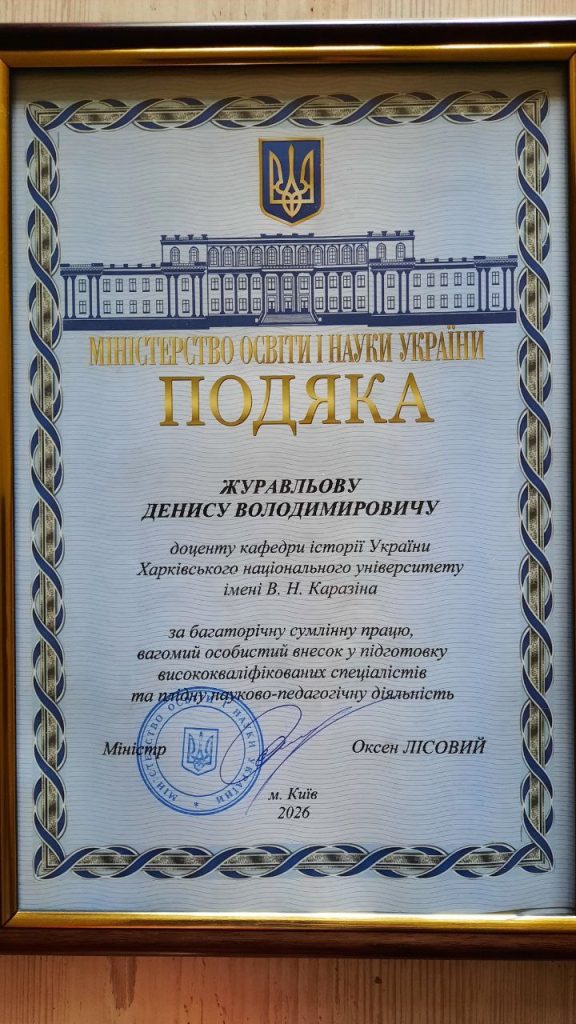 Подякою Міністерства освіти і науки України за багаторічну сумліну працю, вагомий особистий внесок у підготовку висококваліфікованих спеціалістів та плідну науково-педагогічну діяльність було нагороджено доцента кафедри історії України Дениса Журавльова.